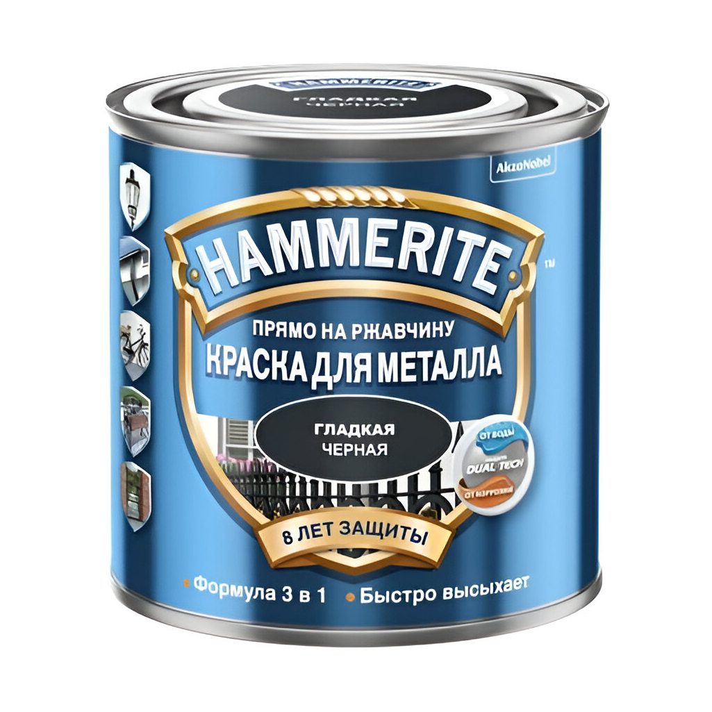 Глянцевая краска Hammerite по металлу для внутренних и наружных работ подходит для нанесения на ржавые неокрашенные и окрашенные ранее поверхности из чёрных металлов. Краска создаёт атмосферостойкое и водоотталкивающее гладкое покрытие даже на ржавом металле. Быстро высыхает на поверхности, образуя эластичное покрытие. Термостойкость покрытия до 80 С°. Товар произведен в России. Она обеспечивает долговечное и эстетичное покрытие, устойчивое к влажной уборке, что делает её идеальным выбором для помещений с повышенной влажностью. Благодаря своей формуле, краска легко наносится и равномерно распределяется по поверхности, создавая ровное и гладкое покрытие. Hammerite также отличается экологической безопасностью, не содержит вредных веществ и подходит для использования в жилых помещениях.
