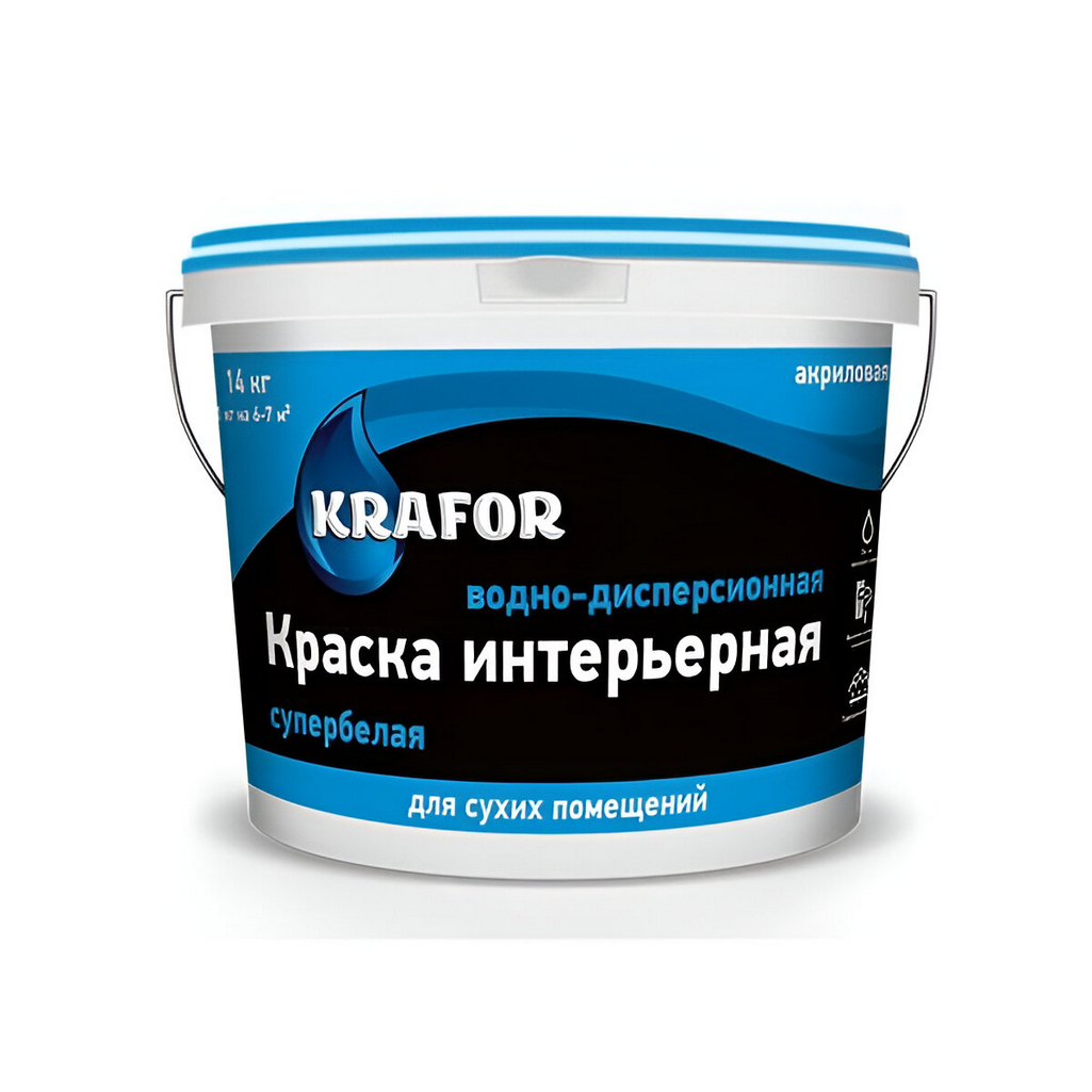 - Краска KRAFOR интерьерная, водно-дисперсионная, супербелая 14кг