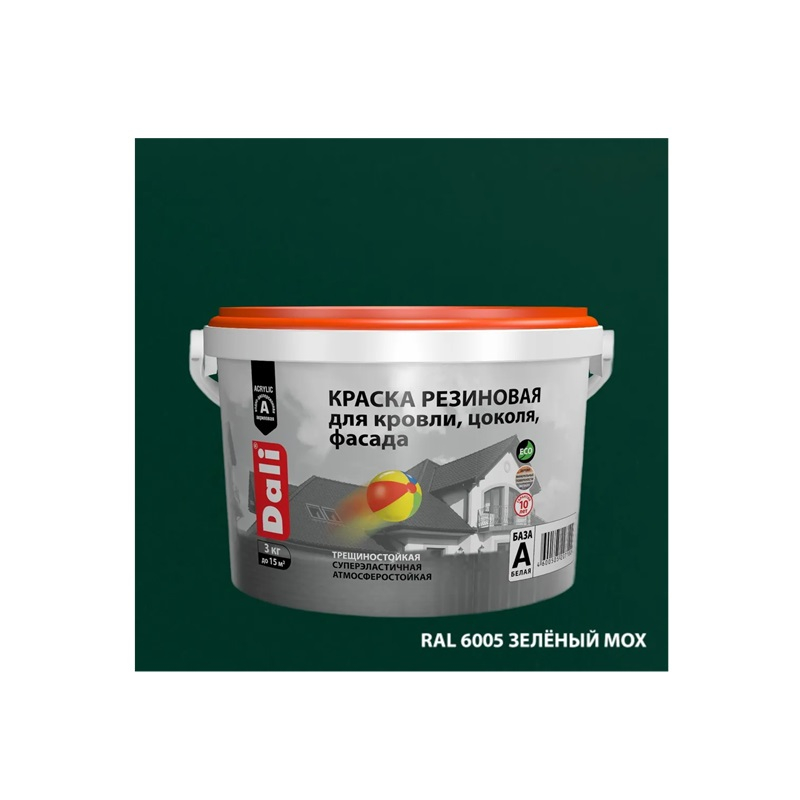 Краска резиновая DALI для кровли, цоколя, фасада, зеленый мох RAL6005 3кг предназначена для защитно-декоративного окрашивания крыш, фасадов, цоколя зданий и сооружений, требующих долговременной эксплуатации и подверженных образованию трещин, а также декоративного окрашивания стен и потолков в жилых и общественных помещениях с повышенной влажностью воздуха или неотапливаемых. Область применения: по минеральным поверхностям (шифер волнистый и плоский, черепица цементно-песчаная, бетонные изделия, кирпич, цементно-стружечные плиты, асбестоцементные плиты, фиброцементные плиты, цементно-песчаные штукатурки, гипсокартон); по различным конструкциям (панели, модули) из воздушно-сухой древесины, ОСБ, ДСП, ДВП применяемых при строительстве каркасно-панельных и модульных домов; по оцинкованной стали, загрунтованным металлическим поверхностям, по искусственной черепице. Образует резиновое глубоко матовое шелковистое покрытие, устойчивое к механическим воздействиям и загрязнениям. Отличается высоким сопротивлением к растрескиванию, идеально подходит для новых зданий с естественной усадкой. Содержит активный антисептик, обеспечивает надежную защиту от плесени и грибка.