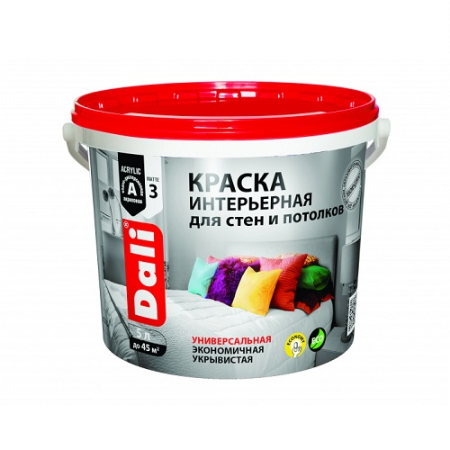 Краска DALI интерьерная для стен и потолков универсальная, База А белая 5 л образует влагостойкое глубокоматовое шелковистое покрытие. Моющаяся, выдерживает многократное количество циклов истираний с применением бытовой химии без образования залоснившихся участков и потери толщины покрытия. Обладает пониженным грязеудержанием: не впитывает загрязнения, легко отмывается от любых бытовых пятен. Легко наносится, равномерно распределяется по поверхности, не разбрызгивается, не образует разводов и подтеков, не оставляет следов и не капает с малярного инструмента. Отличается высокой укрывистостью и низким расходом, образует паропроницаемое («дышащее») покрытие. Не желтеет и не теряет цвет в процессе эксплуатации, не мелит, не имеет неприятного запаха.