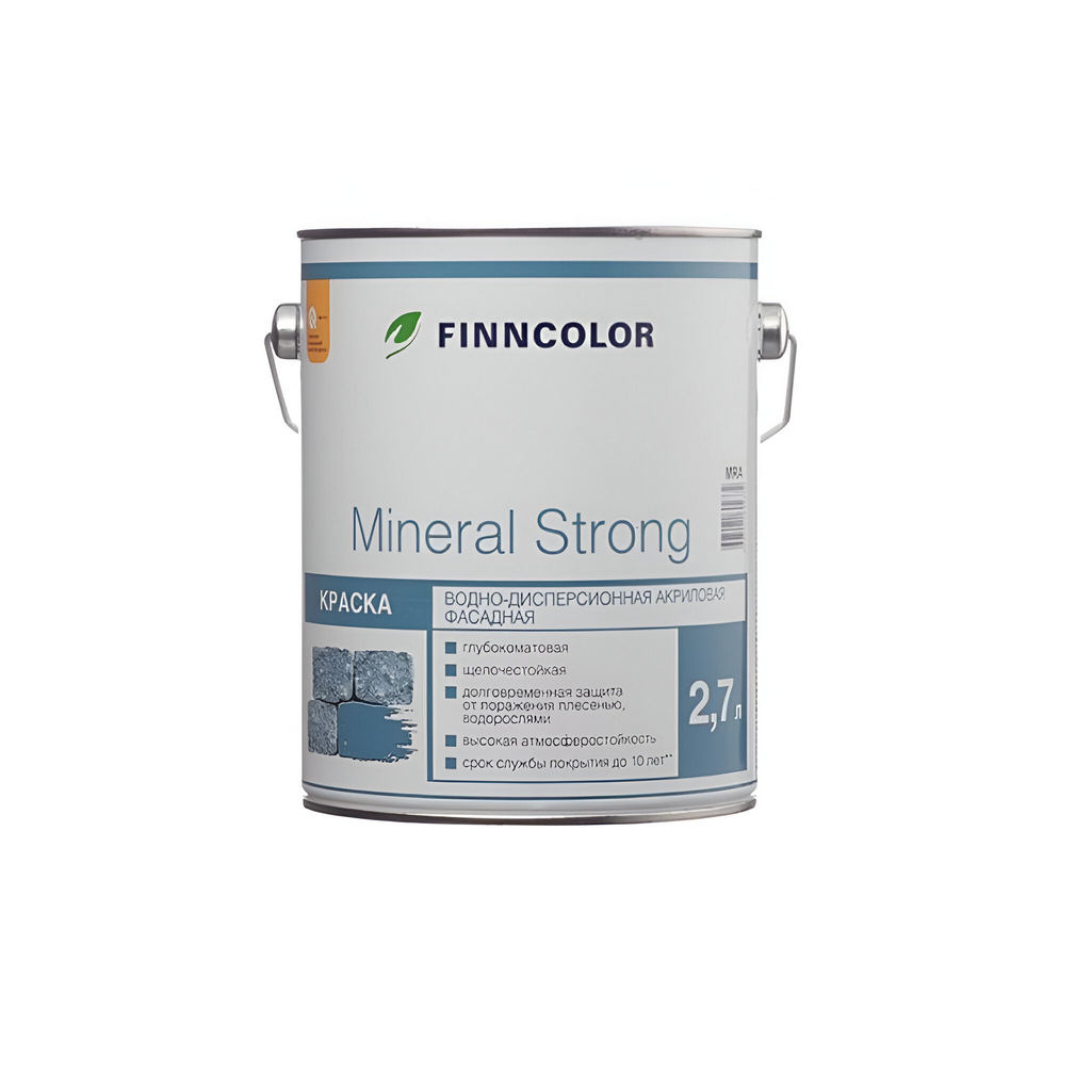 Краска Finncolor Mineral Strong акриловая фасадная, глубокоматовая, База С, 2,7 л - это водно-дисперсионная акриловая щелочестойкая глубокоматовая краска для фасадов. Предназначена для использования снаружи помещений, защиты нового и ранее окрашенного бетона, известково-цементной штукатурки, силикатного кирпича, фибро и асбестоцементных плит, образует паропроницаемое атмосферостойкое покрытие. Покрытие краски обеспечивает долговременную защиту от поражения плесенью и водорослями. Время высыхания 2 часа, степень блеска - глубокая матовая. Краска устойчива к мытью, поверхность гладкая. Высыхание: при (20±2) ºС и относительной влажности (65±5)% - 2 часа. Следующий слой можно наносить через 12 часов. При температуре воздуха ниже +15°С и относительной влажности воздуха выше 65% следующий слой наносить не ранее, чем через 24 часа.