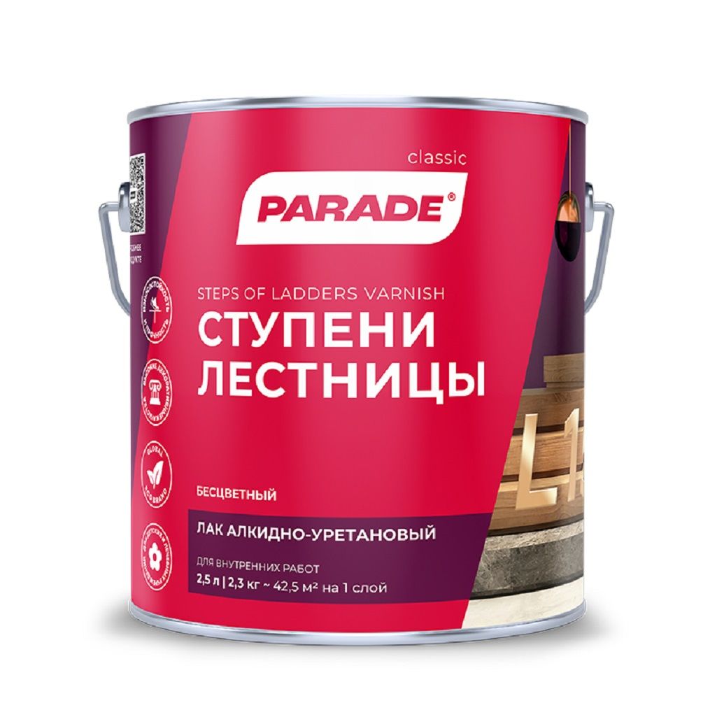 - Лак алкидно-уретановый PARADE L15 Ступени & Лестницы Полуматовый 2,5л Россия
