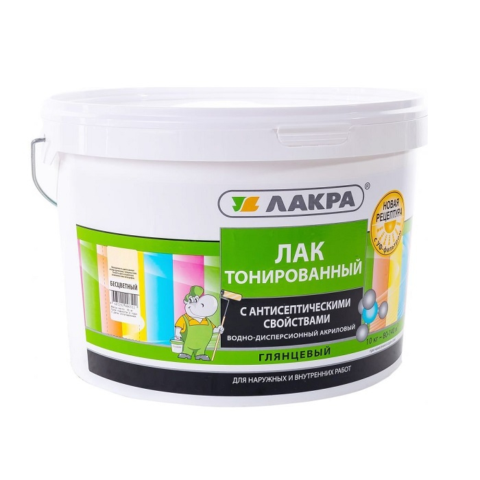 Тонированный лак Лакра водно-дисперсионный акриловый бесцветный 10 кг предназначен для обработки деревянных поверхностей внутренней и наружной отделки. Лак можно использовать для нанесения на минеральные поверхности внутренней отделки помещений. Лак содержит добавку, которая предотвращает выцветание и разрушение покрытия под воздействием ультрафиолета. Лак эффектно подчеркивает красоту деревянных волокон и защищает дерево от вредных влияний (влага, грязь). Возможно лакировка уличных конструкций. Кроме дерева, допустимо лакировать минеральные материалы (камень, кирпич, бетон, керамика), но только внутри помещений.