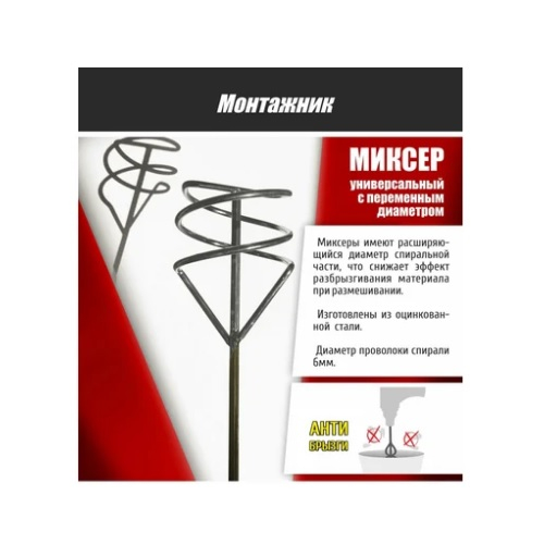 Миксер строительный Монтажник SDS+ 120х450 мм имеет расширяющийся диаметр спиральной части, что снижает эффект разбрызгивания материала при размешивании. Изготовлен из оцинкованной стали. Диаметр проволоки спирали – 6 мм.