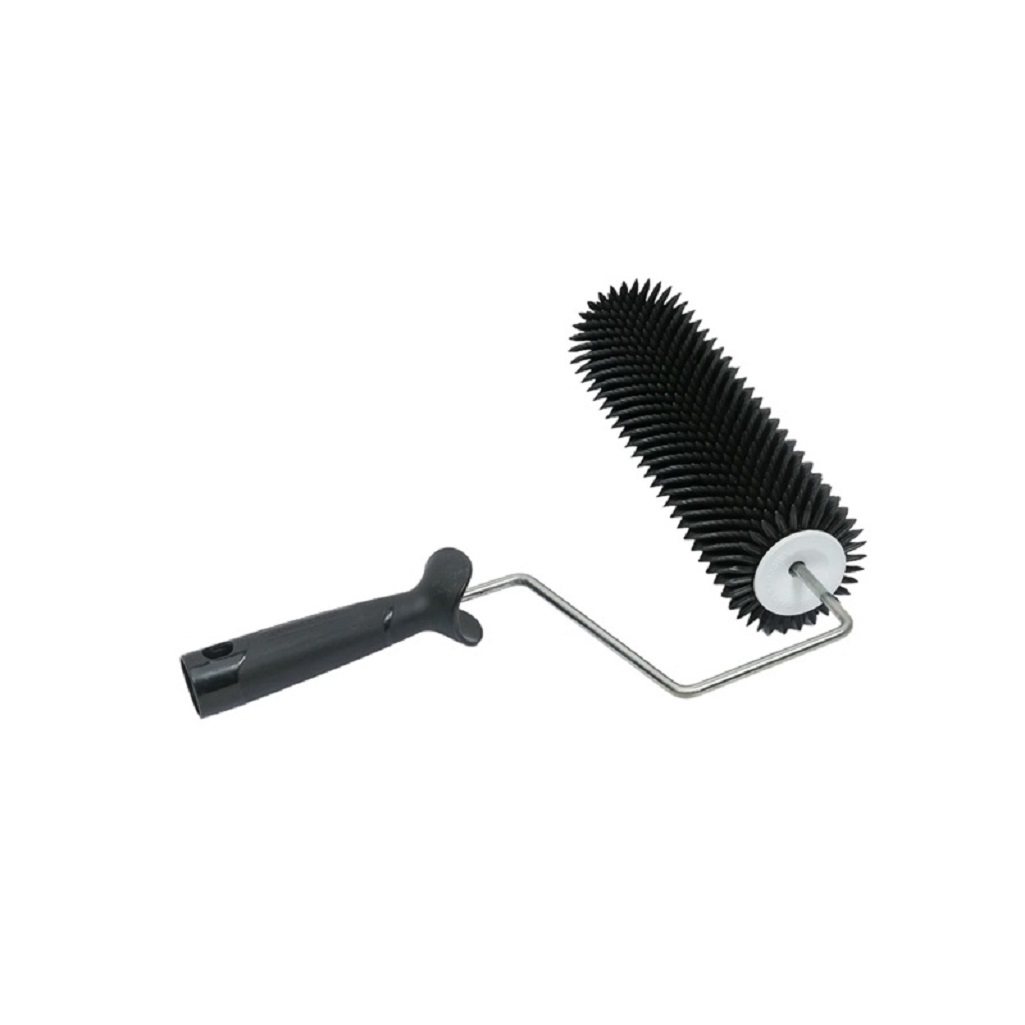 Валик малярный Decor Black Edition 111-6240, длина 240 мм, игольчатый, высота иглы 14 мм используется для удаления пузырьков воздуха при устройстве наливных полов. Острые конусообразные иглы сводят на нет появление пузырьков воздуха с момент выхода иглы из смеси. Валик комплектуется ручкой и может быть использован со стержнем-удлинителем. Как правило, он применяется при монтаже наливного пола. Когда для заливки пола готовится смесь, при размешивании в ней образуются в большом количестве воздушные пузырьки. Если их не ликвидировать, то наливное покрытие будет менее прочным из-за микропустот, которые сформируются в затвердевшем слое. А применение игольчатого валика для наливного пола позволяет удалить пузырьки воздуха из толщи еще жидкого покрытия путем интенсивного его прокатывания по распределенному на поверхности основы раствору.