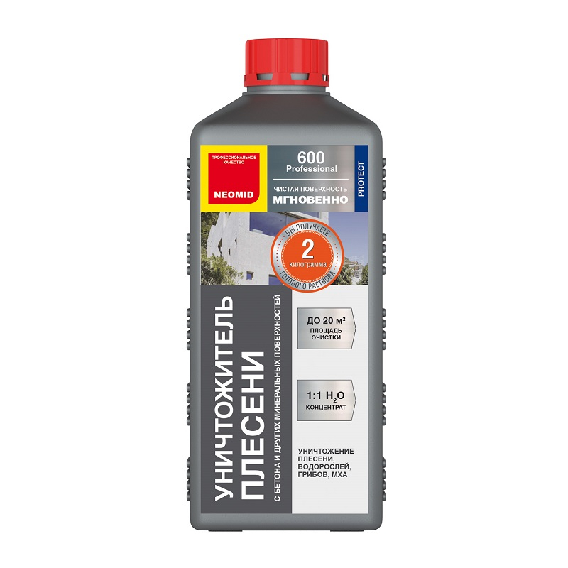 NEOMID 600 мгновенно удаляет серый налет, эффективно и быстро уничтожает грибы, мхи, лишайники, водоросли, бактерии с бетона, кирпича, камня и других минеральных поверхностей.