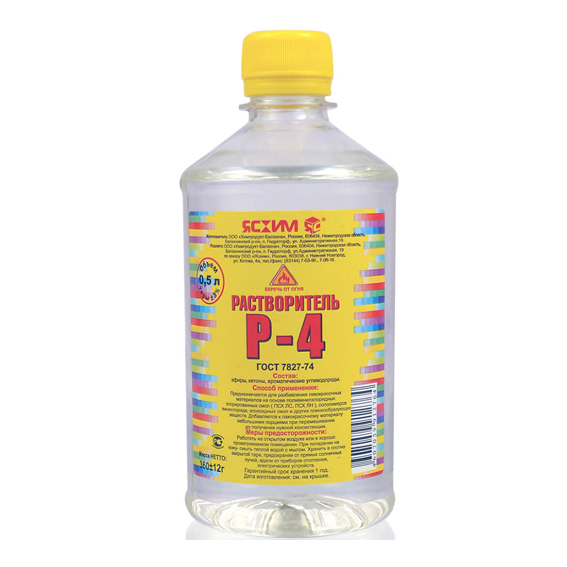 Растворитель Р-4 используется для очищения поливинилхлоридных поверхностей от эмали, лака, нитролака. Применяют для разбавления лакокрасочных изделий, эпоксидных смол и некоторых других химических веществ. Он быстро разводит эмали, лак до нужной густоты перед окраской.