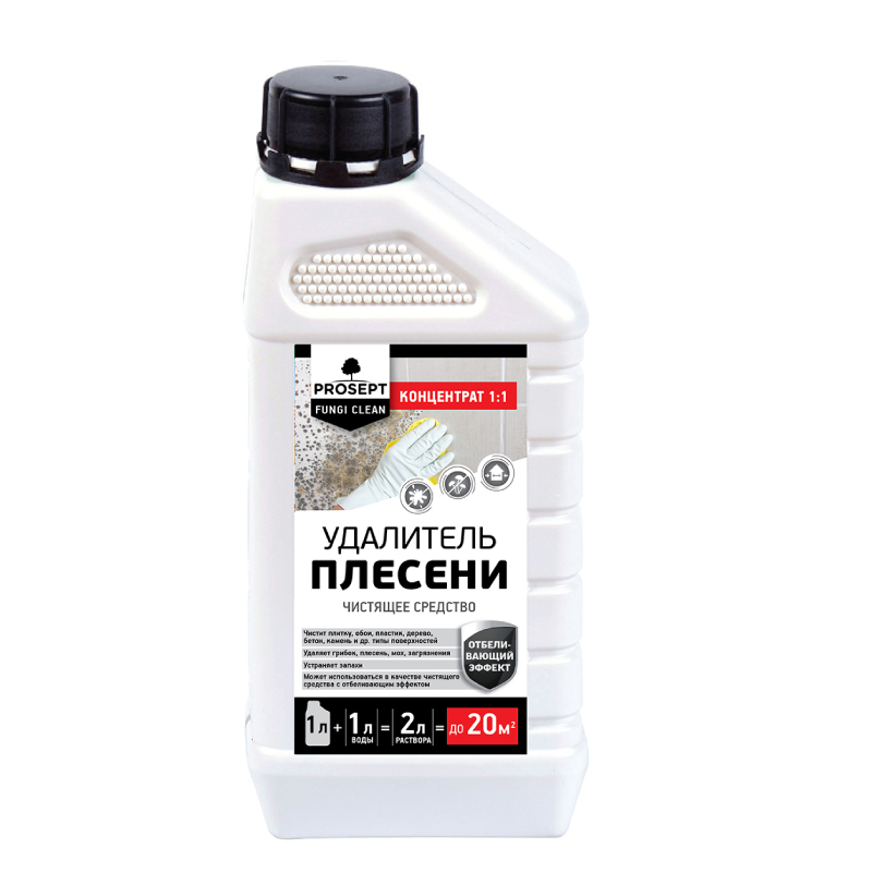 PROSEPT FUNGI CLEAN – эффективное средство для удаления плесени, грибка, мха, водорослей, слизистых, мыльных и других глубоко въевшихся загрязнений с керамической плитки и стыков, обоев, пластика, дерева, бетона, гипсокартона, крашеных поверхностей, искусственного и натурального камня, цоколя, бордюров, памятников и т. п.
