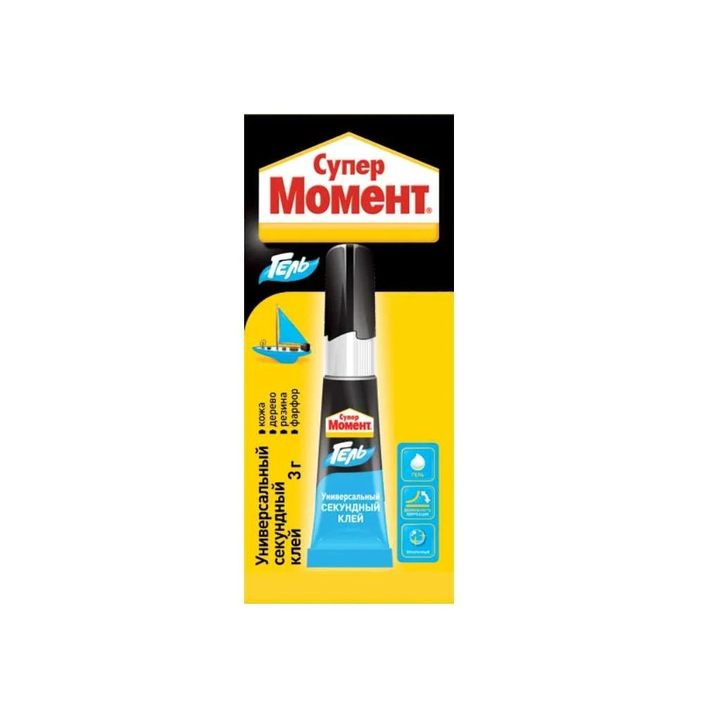 Клей Henkel Момент Супер, Гель, универсальный, секундный, однокомпонентный, 3 г применяется для склеивания различных видов пластмасс, резины, металлов, дерева, фарфора, керамики, кожи, пробки, тканей, картона и бумаги. Не пригоден для склеивания полипропилена, полиэтилена, политетрафторэтилена (тефлона), стекла, глазированных поверхностей и силиконовой резины. Также не пригоден для склеивания очень мягкой кожи.