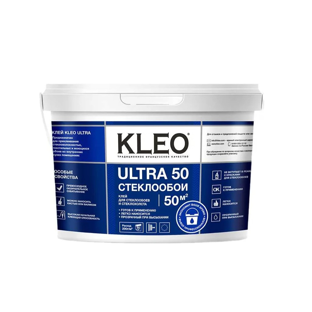 Описание клея обойного Kleo Ultra 50 Стеклообои, для стеклообоев и стеклохолста, 10 л