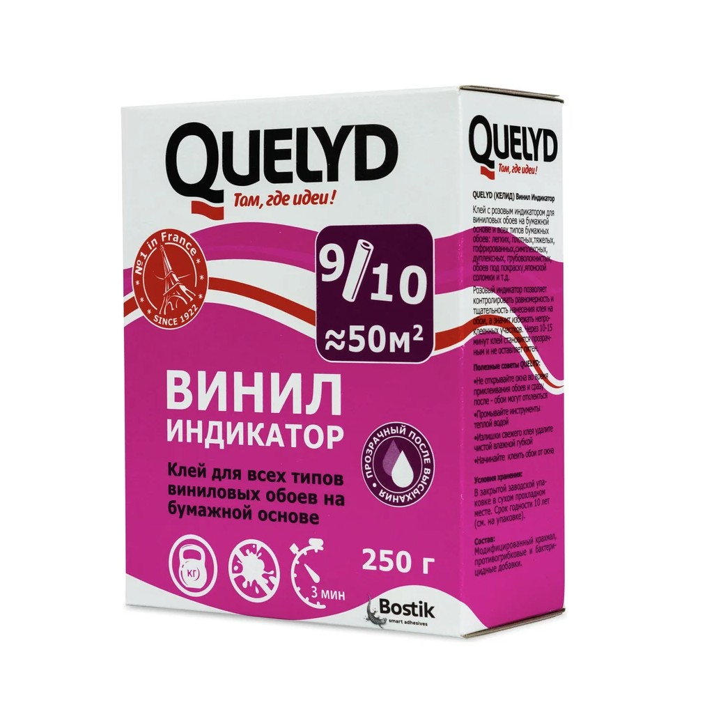 Клей обойный Quelyd Винил индикатор, для всех видов виниловых обоев, 9-10 рулонов, 250 г