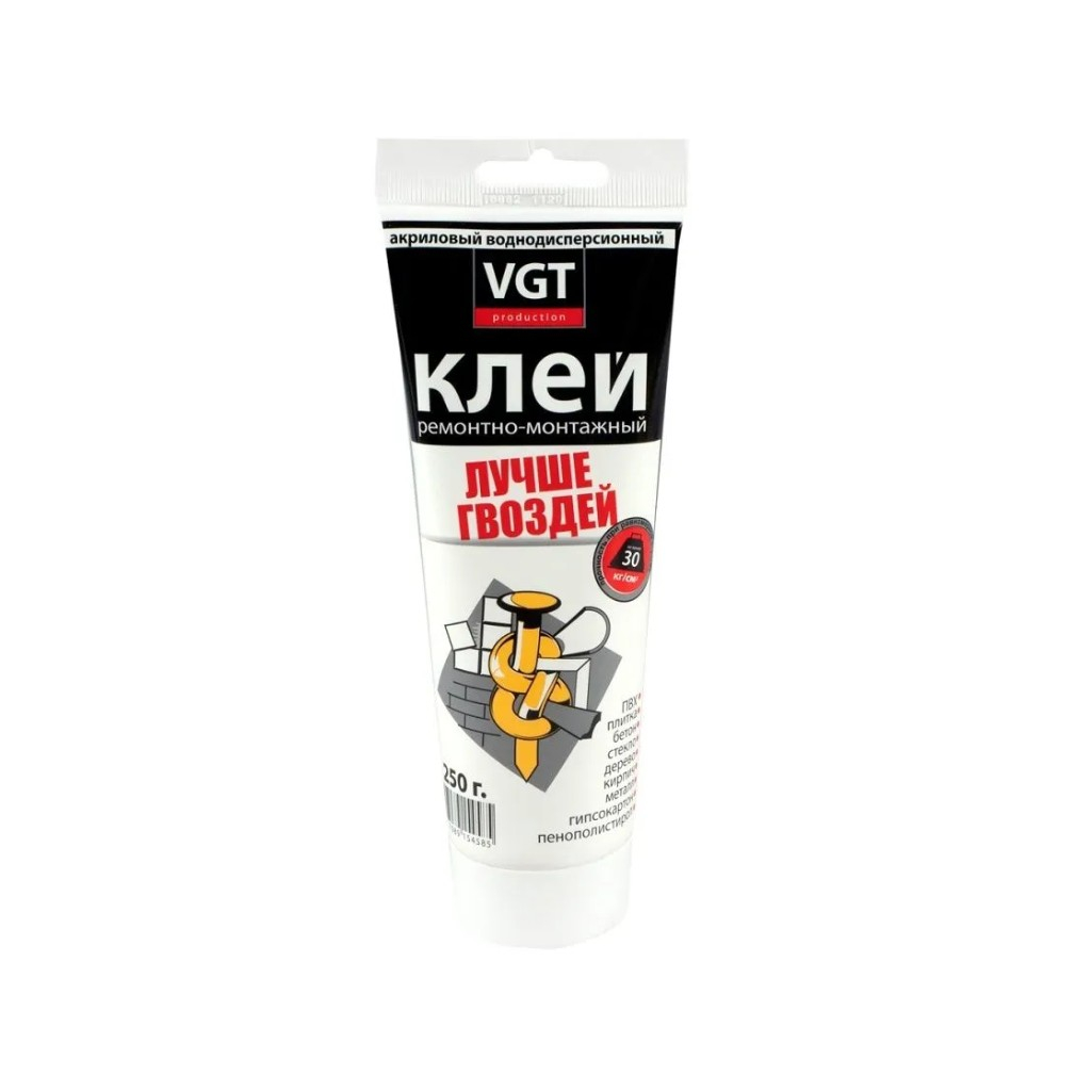 Клей VGT Лучше гвоздей ремонтно-монтажный, акриловый, универсальный, 250 г, предназначен для проведения внутренних и наружных ремонтно-монтажных работ, обеспечивая прочное склеивание большинства строительных материалов, таких как стекло, дерево, МДФ, ДСП, ламинат, паркет, металл, пенополистирол, гипсокартон, бетон, керамика и другие. Этот клей отличается высокой адгезией к различным поверхностям, включая дерево, бетон и кирпич, что делает его универсальным решением для широкого спектра задач в строительстве и ремонте. Он образует эластичную прозрачную пленку, которая обеспечивает не только прочность, но и эстетичный вид соединения. Клей VGT обладает хорошими прочностными свойствами, что гарантирует долговечность и надежность выполненных работ. Он подходит для использования как внутри, так и снаружи помещений, демонстрируя устойчивость к воздействию влаги и других внешних факторов. Благодаря своей влагоустойчивости, этот клей является надежным выбором для работ в различных климатических условиях.