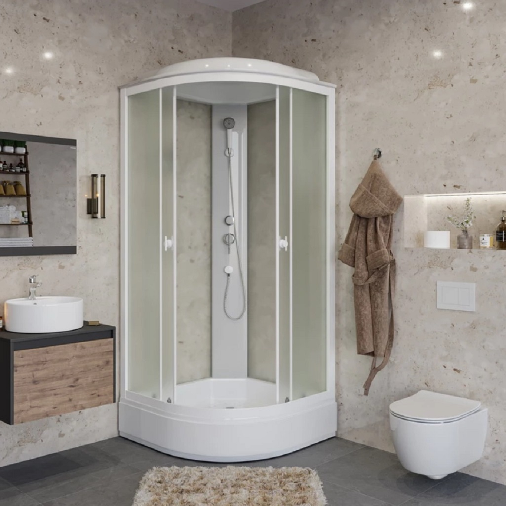 Ориентация кабины угловая, форма - четверть круга, гарантия составляет 10 лет.