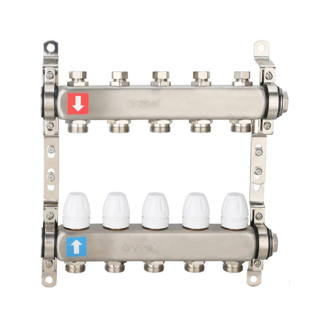 Коллектор Gappo G428.5 регулируемый с запорными клапанами, 5выходов, 3/4 НР идеально подходит для установки в системах отопления и водоснабжения. Этот высококачественный продукт, изготовленный из нержавеющей стали, обеспечивает надежность и долговечность использования.