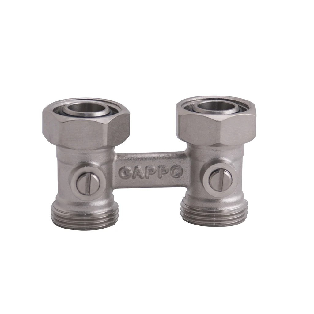 Узел нижнего подключения отопительных приборов при расположении присоединительных патрубков с межосевым расстоянием 50 мм подходит для двухтрубных систем отопления. Клапан снабжен шаровыми затворами для перекрытия потока. Резьба патрубков для присоединения труб - наружная - 3/4", под фитинг стандарта евроконус. Патрубки для подключения к радиатору - с накидной гайкой, резьба - внутренняя - 3/4", стандарта евроконус.