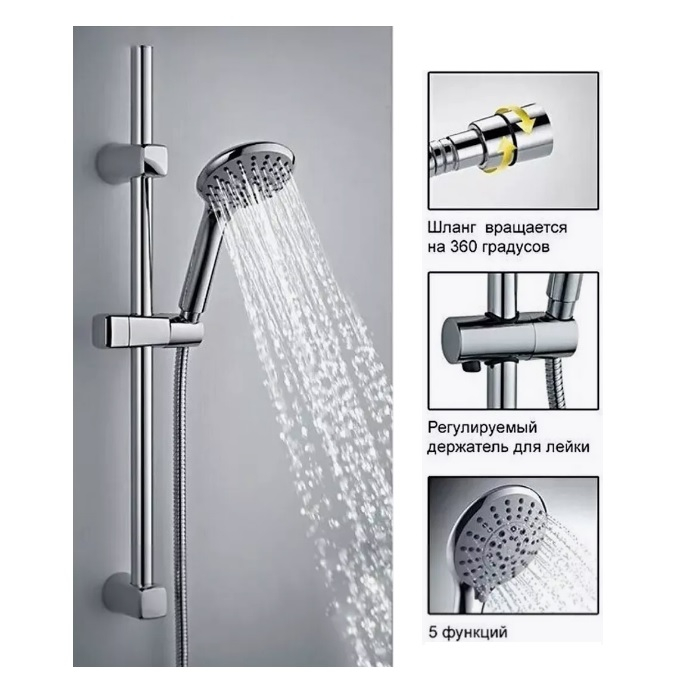 | Комплектация | ручная душевая лейка, шланг, штанга, держатель душа, крепеж. |