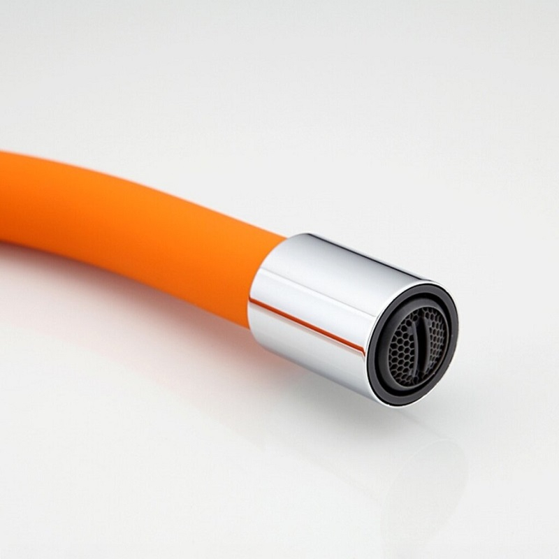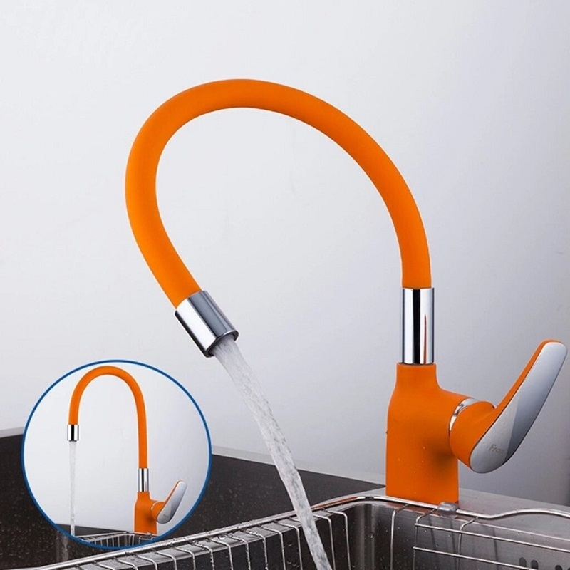 Смеситель для кухни Frap F4453-02 выполнен в силиконовом корпусе оранжевого цвета, материал деталей - латунь, кран с гибким изливом, однорычажный.
