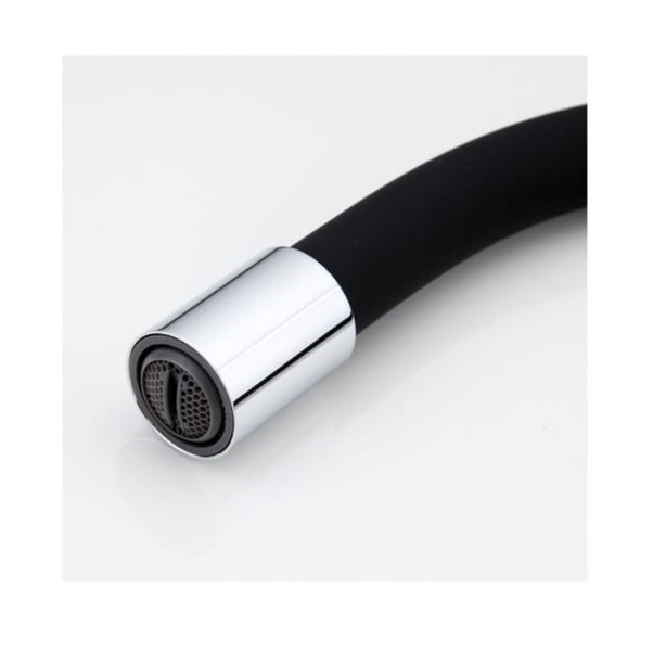 Смеситель для кухни Frap F4453-04 с гибким изливом, однорычажный, выполен из латуни - прочного, надежного и долговечного материала, с корпусом из силикона матового черного цвета, фиксируется в выбранном положении. Смеситель имеет одну рукоять чтобы регулировать напор воды. Выделяется комфортным управлением и надежной стабильностью на протяжении работы, в связи с этим пользуется на текущий момент немалой востребованностью у заказчиков. Наличие аэратора в данном приборе поможет обеспечить равномерную подачу воды и ее смягчение. Специальная сетка отфильтровывает различные примеси. Прибор устанавливается с помощью гайки, нижняя часть вставляется в отверстие для установки и затягивается гайкой. Современный прибор – соединение классических конструкционных решений и смелого и необычного дизайна. Довольно часто модели такого вида покрываются высококачественным покрытием, и в итоге имеют идеальный внешний вид. Один из традиционных вариантов оформления сантехнических смесителей. Его округлая форма помогает прибору выглядеть максимально стильно и привлекательно для человека. Основная особенность данного прибора – гибкий излив, который обладает памятью. С помощью этого возможно двигать смеситель в разнообразных направлениях, в то время как он сохраняет определенное положение. Монтаж выполняется на одно отверстие.