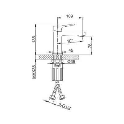Смеситель монтируется на горизонтальную поверхность и имеет диаметр монтажных отверстий 35 мм с гибким типом подводки, и присоединительным размером -1/2", и керамическим запорным картриджем.