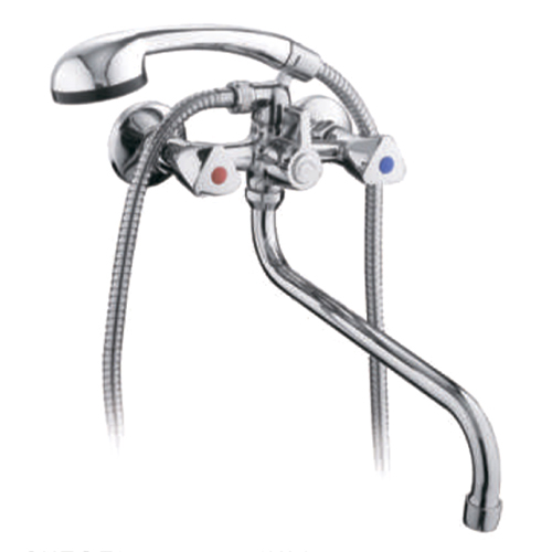 Смеситель для ванны Frud R22111, присутствует два рычага, каждый контролирует температуру и напор воды. Аэратор в приборе позволяет обеспечить равномерный поток воды и ее относительноесмягчение. Специальная сетка внутри устройства отфильтровывает разнообразные примеси. Монтируется на стене с целью подключения подводки из стены. данная модель в классическом стиле. Приборы из силумина наделены непродолжительным сроком работы по причине низких эксплуатационных качеств этого материала. Однако, это хороший вариант временного смесителя, большим превосходством которого будет очень низкая стоимость. Один из традиционных вариантов оформления смесителя. Его округлая форма помогает выглядеть привлекательно и стильно для человеческих глаз. У нижнего смесителя излив располагается под рычагом контроля уровня подачи воды. Именно к такому типу относится большинство современных приборов. Излив способен вращаться, что повышает функциональность.