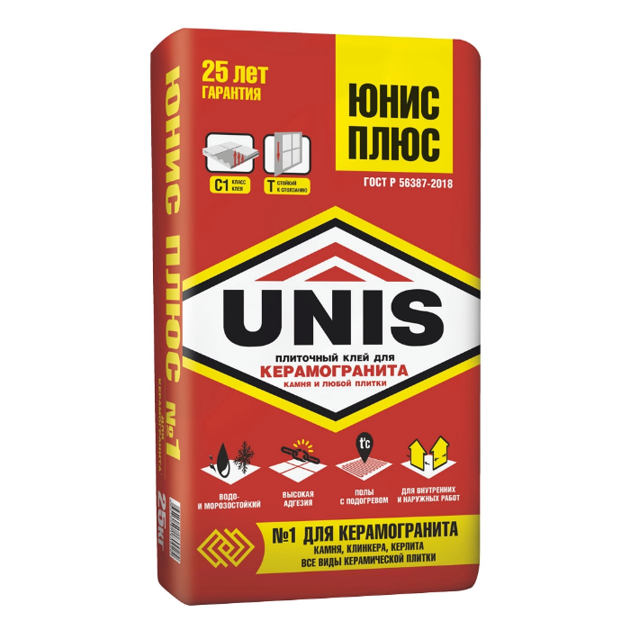 - Клей UNIS Плюс для керамогранита, камня, плитки 25кг