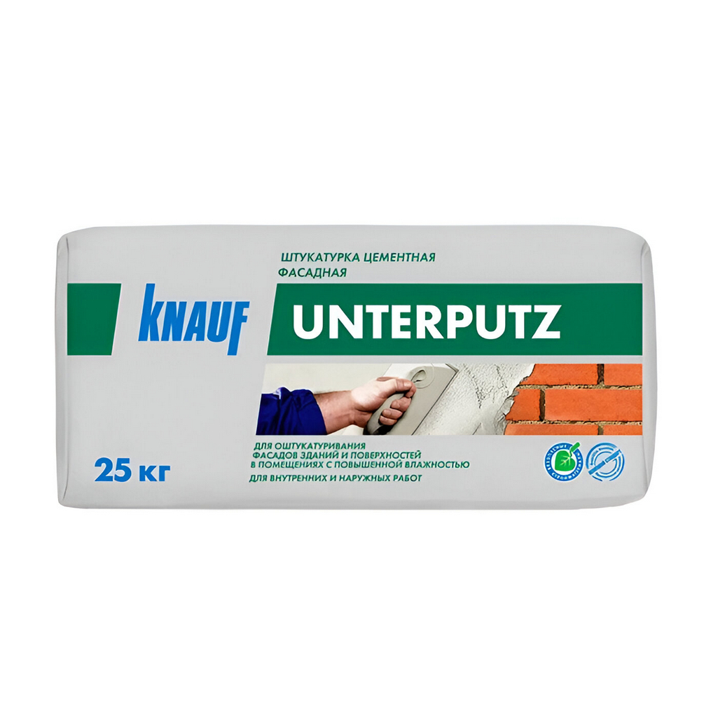 Штукатурка цементная Knauf Унтерпутц, для внутренних и наружных работ, фасадная, 25 кг – это высококачественная сухая смесь на цементной основе, предназначенная для отделочных работ как внутри помещений, так и на фасадах зданий. Поставляется в мешках по 25 кг, удобных для транспортировки и хранения. Данная штукатурка идеально подходит для помещений с повышенной влажностью, таких как подвалы, гаражи и прачечные, а также для создания прочного и долговечного покрытия на фасадах.