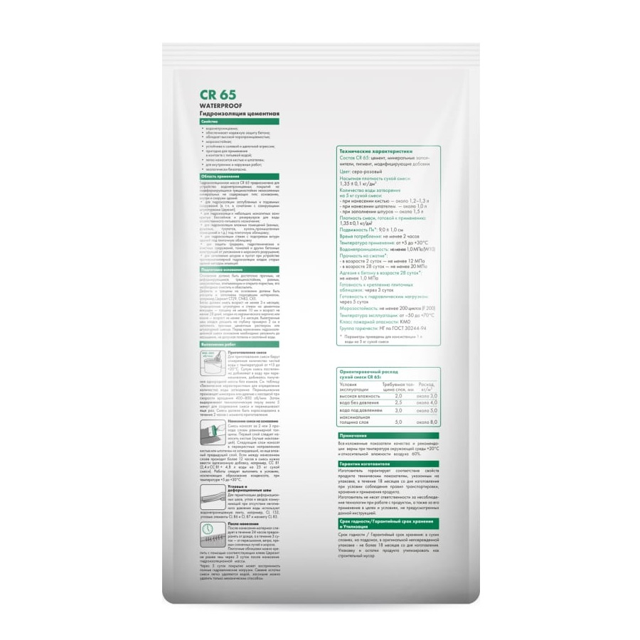 Гидроизоляционная смесь Ceresit CR65 - обмазочная гидроизоляция на цементной основе для защиты оснований из бетона, кирпича, штукатурки, ЦПС, не содержащих гипс. Применяется на полах и стенах внутри и снаружи зданий: во влажных помещениях под плиточную облицовку, заглубленных и подземных сооружениях, небольших крытых бассейнах.