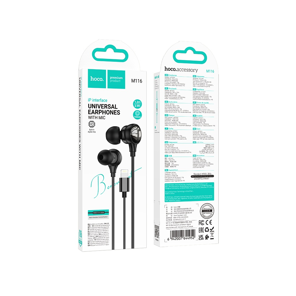 Наушники внутриканальные Hoco М116 iPhone 1.2 м, ABS+TPE, черные