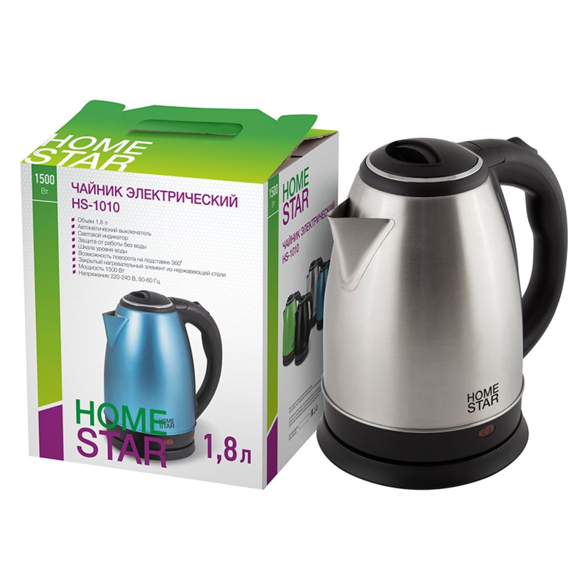 Чайник HOMESTAR HS-1010 объемом колбы 1.8 л, выполнен в стальном корпусе, надежный и практичный, удобен в бытовых целях.