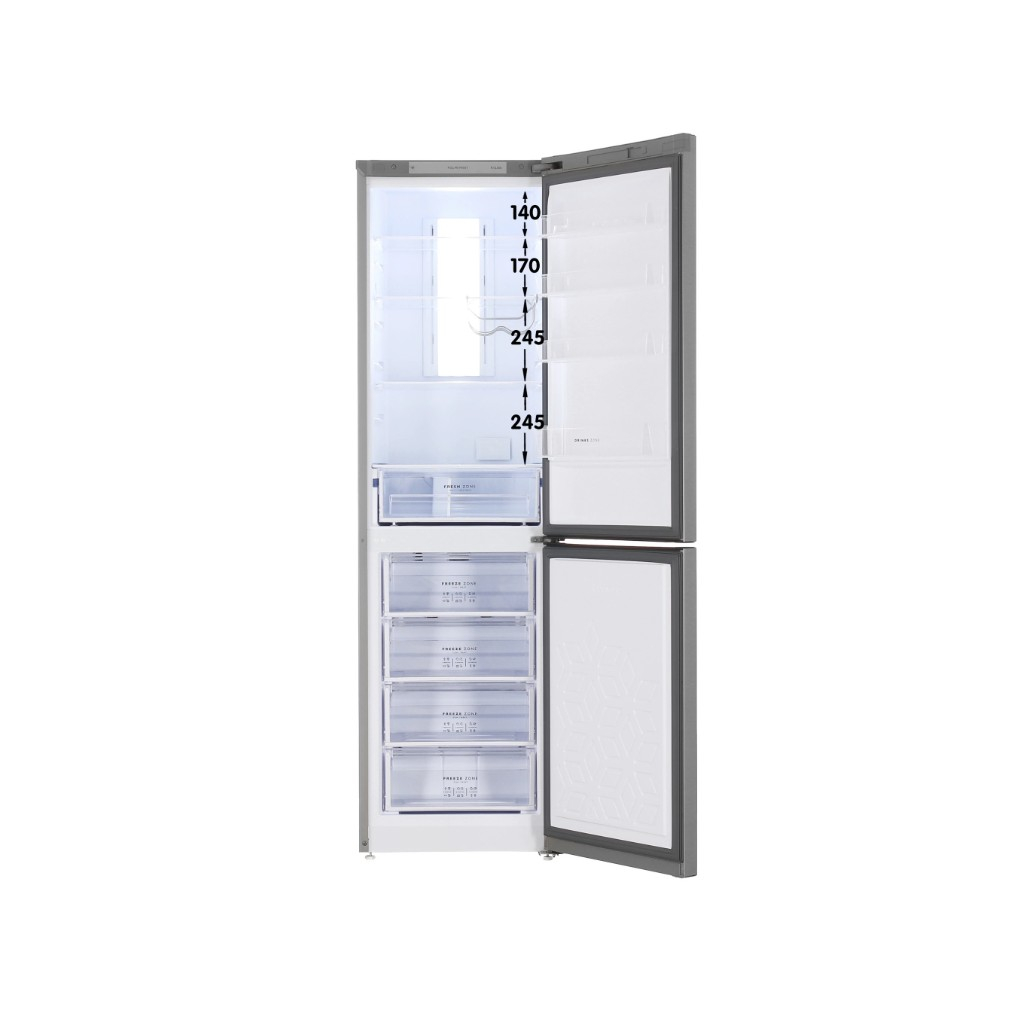 Внутреннее пространство холодильного отделения организовано с учетом современных потребностей: регулируемые стеклянные полки, вместительные контейнеры для хранения овощей и фруктов, а также специальная зона свежести с оптимальными условиями для мясных и молочных продуктов.