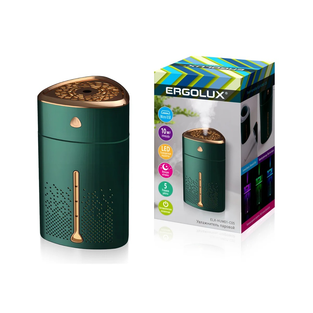Описание увлажнителя Ergolux ELX-HUM01-C05 бесшумного, 5 Вт, зеленый с золотым