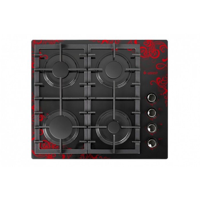 Варочная панель Гефест СВН 2230 К16 имеет стеклянную поверхность черного цвета, украшенную фантазийным узором. Комплектация – 4 конфорки, чугунная решетка, поворотные выключатели. Соединение с газопроводом происходит посредством резьбы G 1/2-В.