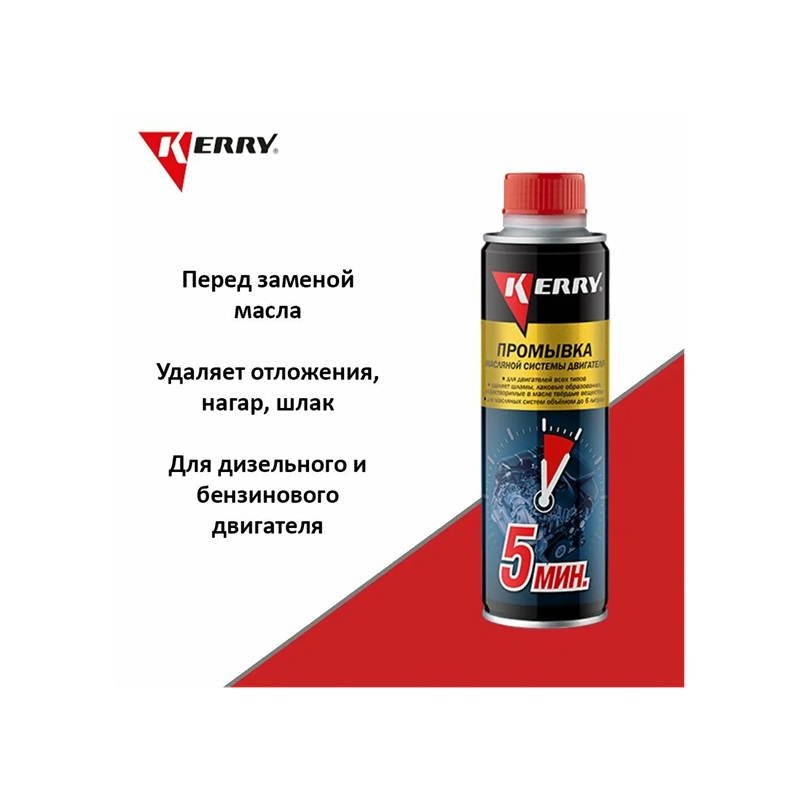 Промывка Kerry масляной системы двигателя 270мл используется перед заменой моторного масла. Очиститель двигателя благодаря комбинации моюще-диспергирующих присадок удаляет всевозможные отложения и нерастворимые в масле твёрдые вещества: нагар, шлам, кокс, лаковые образования. В процессе промывки очищаются масляные каналы, картер, поршневые кольца, гидрокомпенсаторы и другие узлы двигателя. Одного флакона средства достаточно для масляной системы объёмом до 6 литров. Автомобильная пятиминутная присадка подходит для двигателей всех типов.