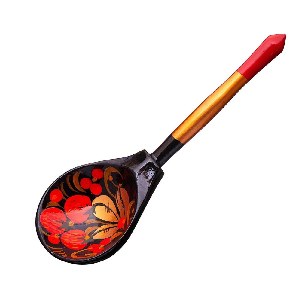 Яркая хохломская роспись (золотые, красные, черные узоры) делает ложку эстетичным элементом сервировки. Подходит для подачи блюд в русском стиле, создает уютную атмосферу. Удобная длина (19 см) подходит для первых и вторых блюд. Дерево не нагревается так сильно, как металл, что снижает риск обжечься. Не царапает посуду (например, антипригарные сковороды или эмалированные кастрюли). Деревянная ложка легче металлической, удобно лежит в руке. Приятные тактильные ощущения.