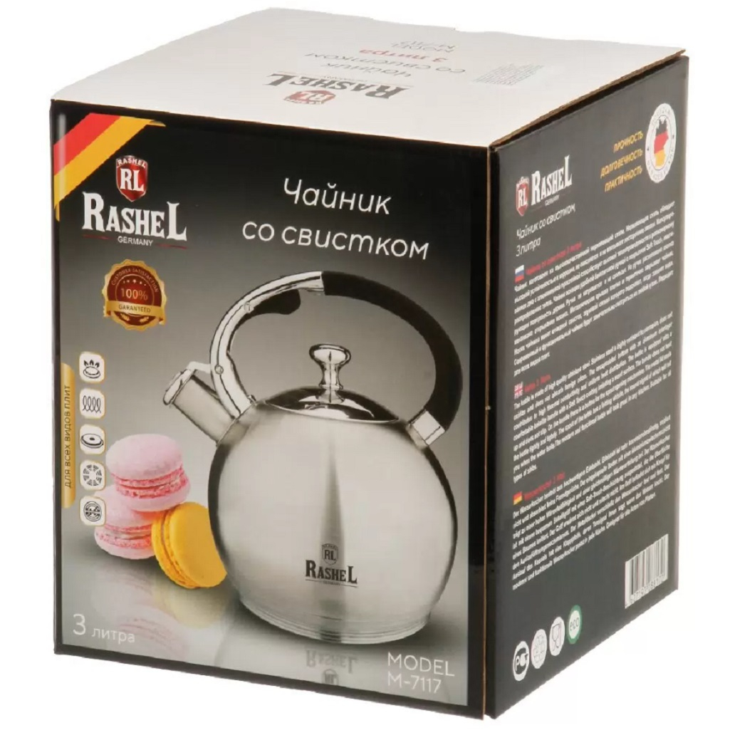 - Чайник RASHEL М-7117 нержавеющая сталь со свистком матовый серебристый, индукция 3л