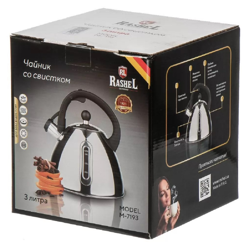 Описание чайника Rashel М-7193 нержавеющая сталь, мерная шкала, серебристый, индукция, 3 л