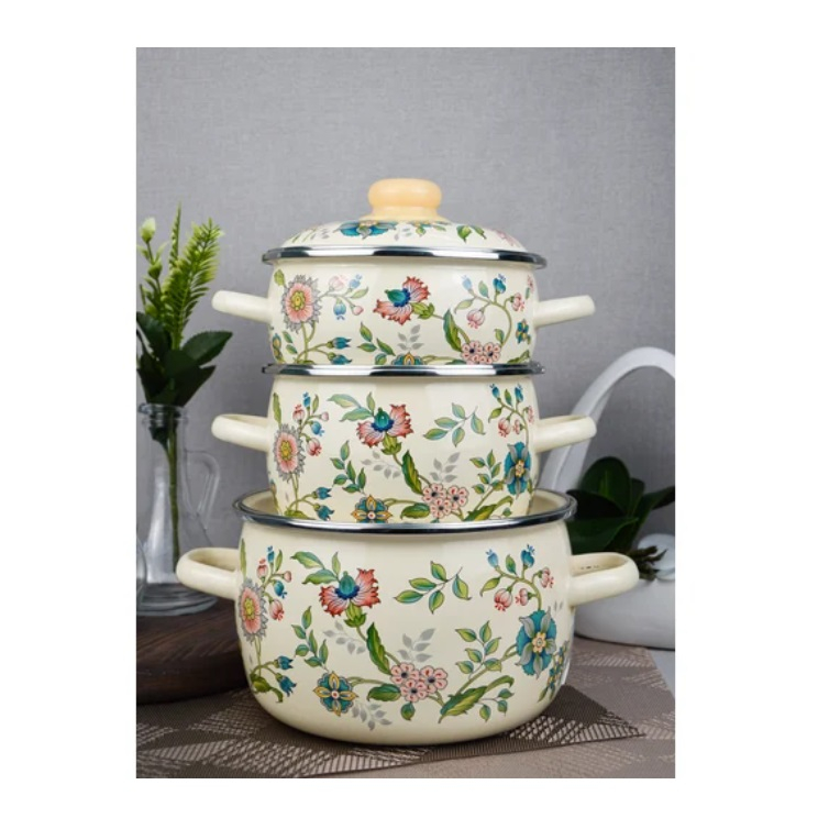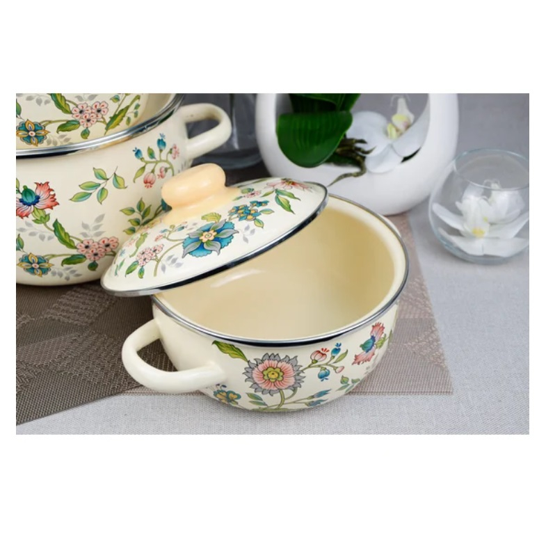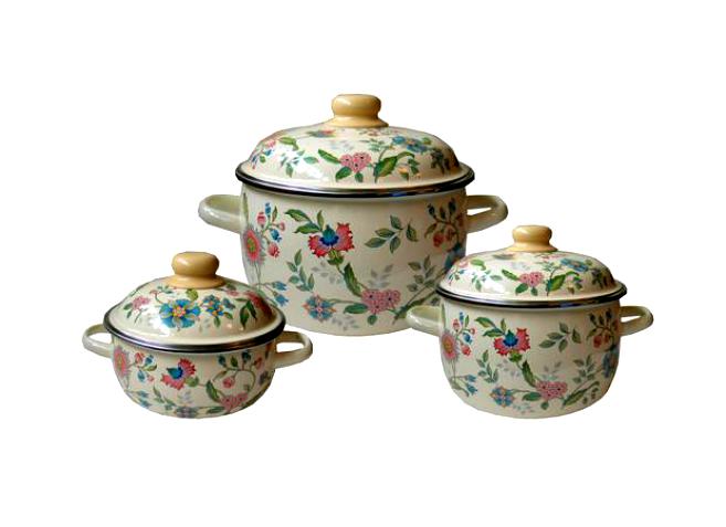 - Набор эмалированных кастрюль СТАЛЬЭМАЛЬ Луговые цветы слоновая кость 1,5л;2л;4л