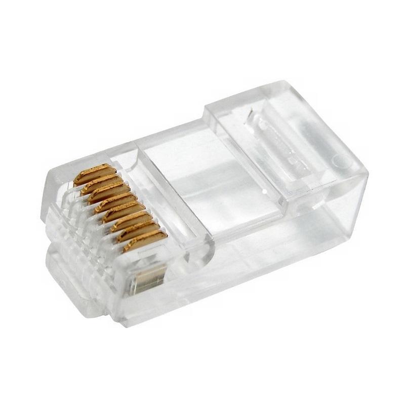 Разъем применяется для построения компьютерных сетей. Его размещают на конце компьютерных или телефонных кабелей для их соединения с розеткой, хабом, свитчом, сервером, модемом, роутером или другим компьютером. Этот штекер является разъемом типа 8Р8С, то есть имеет 8 посадочных мест и 8 ножей-контактов. Джек компьютерный 8Р8С RJ-45 категории 5 не имеет вставки, поэтому кабель разводится по пинам в самом разъеме и опрессовывается специальным инструментом. Штекер изготовлен из качественного пластика прозрачного цвета и имеет золотое напыление на ножах-каонтактах для улучшения контакта с жилами кабеля.