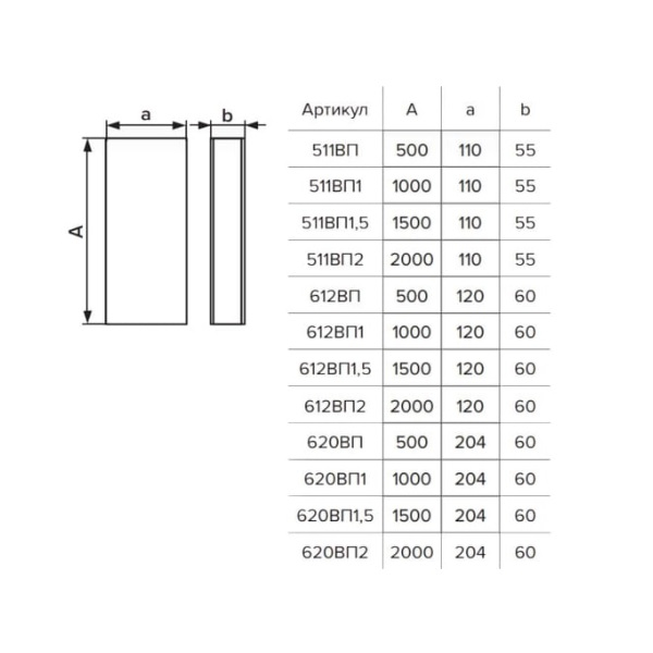Технические характеристики воздуховода прямоугольного ERA 60х204 мм, 2м, пластик 620ВП2