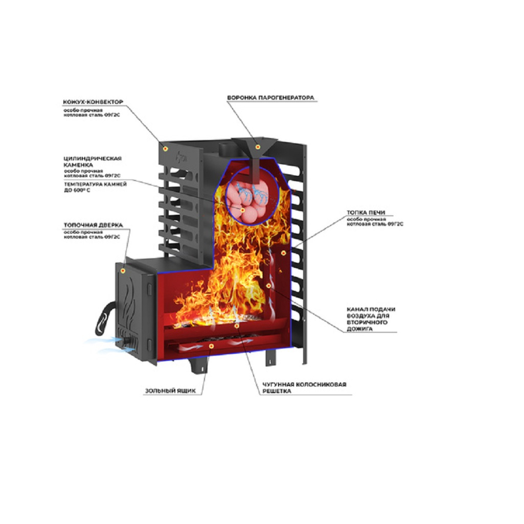 Глубокая невентилируемая каменка-труба из стали 09Г2С толщиной 4 мм прогревается открытым пламенем для максимального нагрева камней, заложенных в нее и выполняет роль пламегасителя. Большая масса камней, закладываемых в сетку-кожух печи, обеспечивает стабильность температуры в парилке и является мощным парогенератором. Длинная колосниковая решетка из массивного литьевого чугуна обеспечивает равномерное и мощное горение дров. Съёмное дно топочной камеры облегчает уход за печью и контроль состояния поддувального пространства.