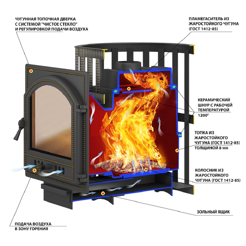 Особенность данной печи заключается в трехэлементной конструкции топки, где стыки герметично соединены керамическим шнуром, выдерживающим температуру до 1200 градусов. Это обеспечивает абсолютную герметичность топки. Для надежного крепления деталей используется болтовое соединение, гарантирующее безопасность при эксплуатации. Банная чугунная печь Легенда Ковка 22 дверка 505 оборудована чугунной герметичной дверцей Везувий 505 с термостойким стеклом SCHOTT ROBAX. Конвекционно-вентилируемый кожух Ковка выполнен из металлической текстурированной полосы, окрашенной термостойкой краской и покрытой патиной Бронза.