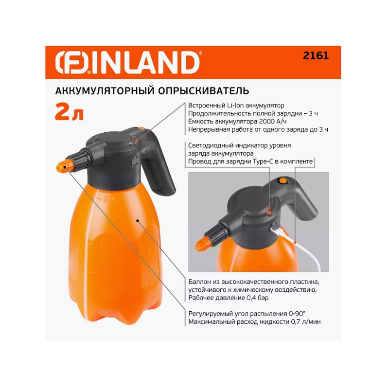 Опрыскиватель FINLAND 2161 аккумуляторный 2 л представляет собой мощного союзника в борьбе с вредителями и болезнями растений, а также идеальное решение для тщательной чистки поверхностей, стен и стекол с использованием моющих средств. Созданный из высококачественного пластика, который не пасует перед химическими реагентами, содержащимися в удобрениях, наш распылитель обеспечивает долговечность и надежность в использовании. Прозрачная полоса для контроля уровня жидкости и светодиодный индикатор заряда аккумулятора обеспечивают максимальное удобство при эксплуатации, позволяя легко отслеживать потребление и необходимость подзарядки устройства. С этим распылителем вы сможете продолжать работу до 3х часов без перерывов благодаря вместительной батарее. Когда же придет время подзарядки, всего за 3 часа устройство будет снова готово к использованию.