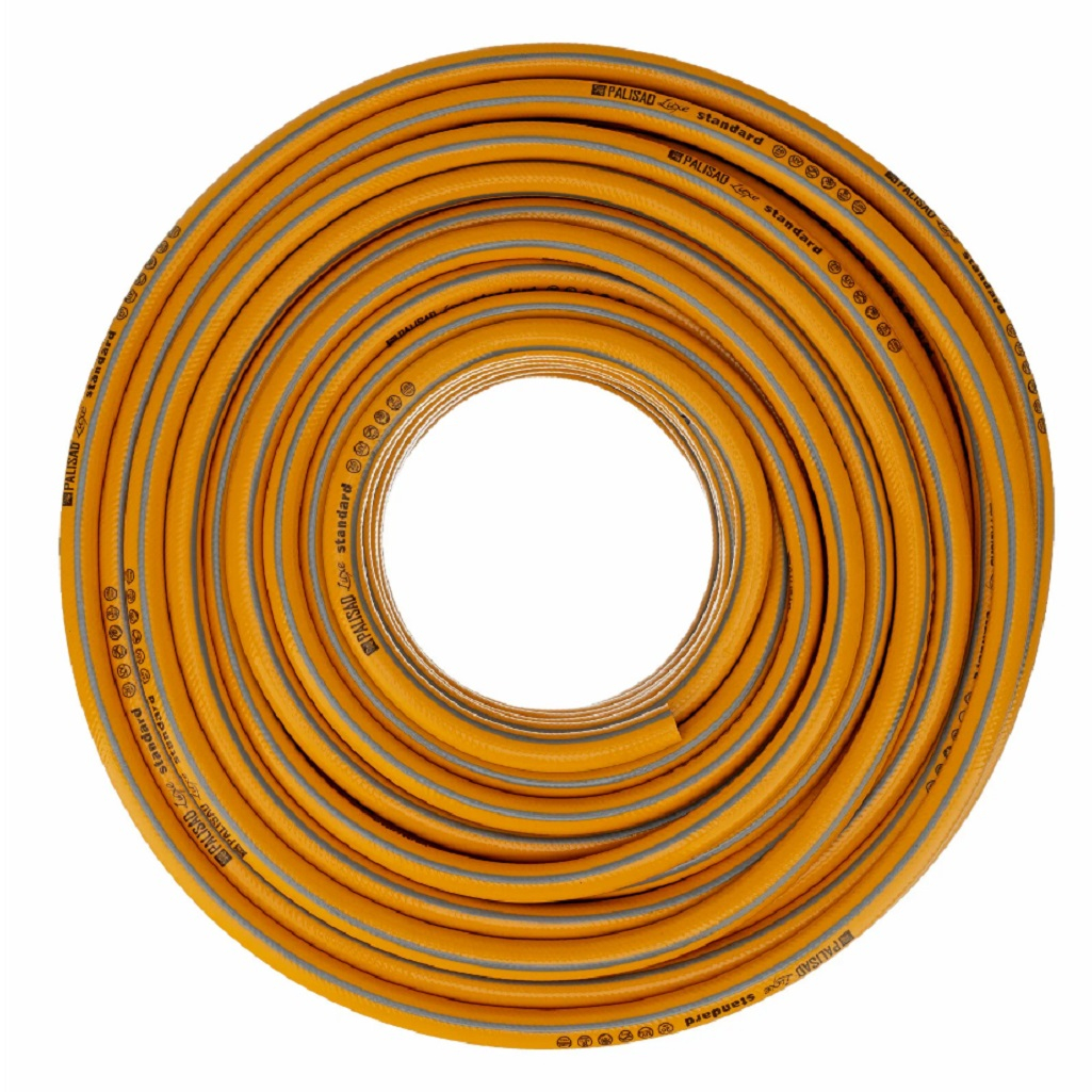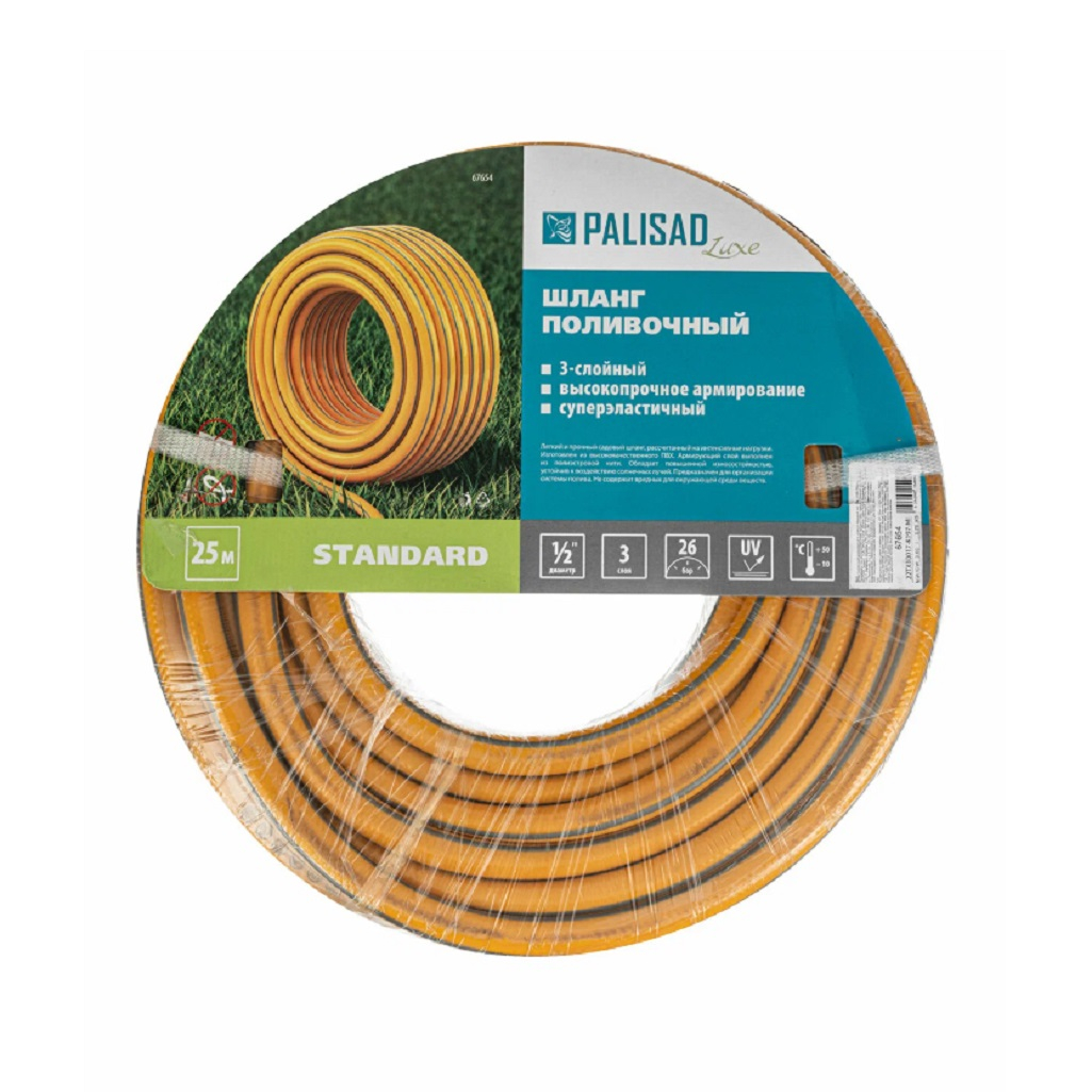 Шланг поливочный Palisad Luxe Standart 1/2" 67654, армированный, бухта 25 м предназначен для полива и орошения садового участка, газона, различных зеленых насаждений. Шланг состоит из 3-х слоев: первые два из ПВХ придают ему гибкость, а третий - из многонитиевого полиэстра - упрочняет конструкцию. Такое строение увеличивает срок службы шланга. Он выдерживает интенсивные нагрузки и не перекручивается благодаря высококачественному, прочному полимерному покрытию. Гладкая поверхность шланга предотвращает его от повреждений и порезов, а также обеспечивает его легкое перемещение на различных неровностях.