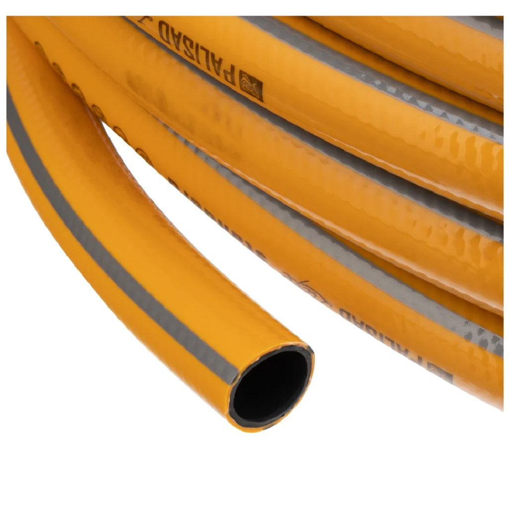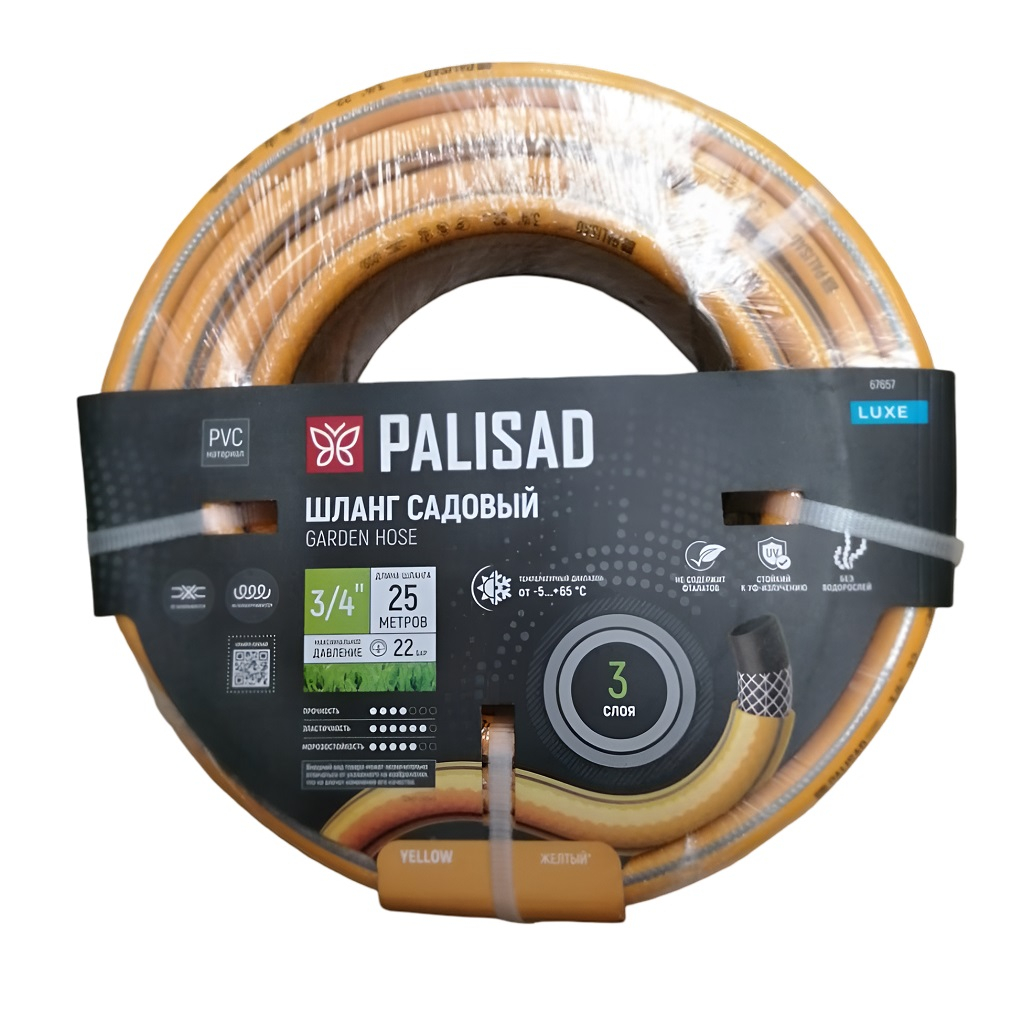 Шланг поливочный Palisad Luxe Standart 3/4" 67657, садовый. армированный, бухта 25 м предназначен для полива и орошения садового участка, газона, различных зеленых насаждений. Шланг состоит из 3-х слоев: первые два из ПВХ придают ему гибкость, а третий - из многонитиевого полиэстра - упрочняет конструкцию. Такое строение увеличивает срок службы шланга. Он выдерживает интенсивные нагрузки и не перекручивается благодаря высококачественному, прочному полимерному покрытию. Гладкая поверхность шланга предотвращает его от повреждений и порезов, а также обеспечивает его легкое перемещение на различных неровностях.