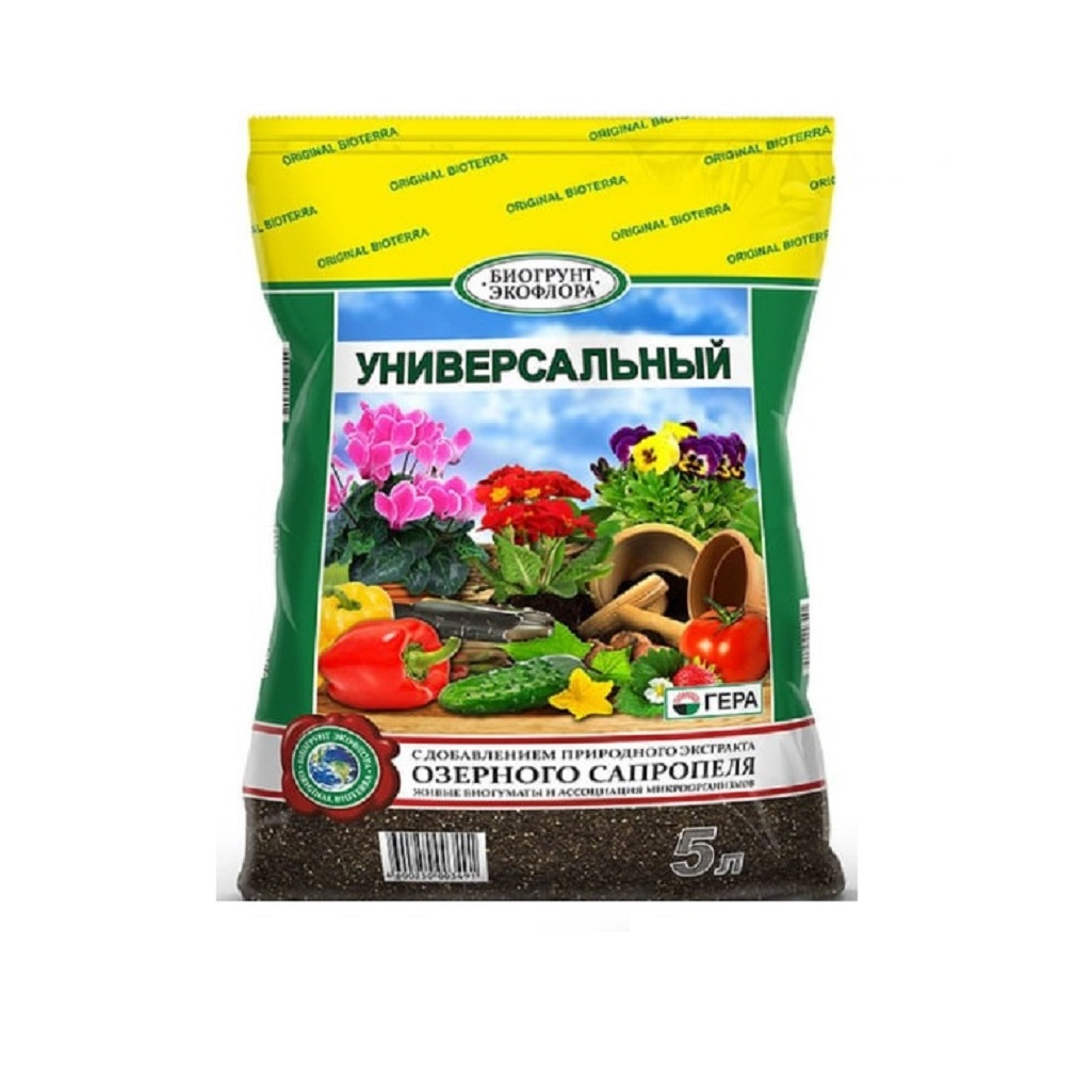 Грунт Гера Биогрунт Экофлора универсальный для овощных, цветочно-декоративных растений, 5 л - полностью готовый к применению грунт для выращивания овощных и цветочно-декоративных растений в открытом грунте (в качестве основной заправки гряд, клумб, альпийских горок и других цветников) и закрытом грунте (в теплице, зимнем саду, комнатном цветоводстве); посадки плодово-ягодных и декоративных деревьев и кустарников; проращивания семян; выращивания овощной и цветочной рассады; выгонки луковичных растений; мульчирования (укрытия) почвы под растениями; посадки, пересадки, подсыпки или смены верхнего слоя почвы у растущих растений.