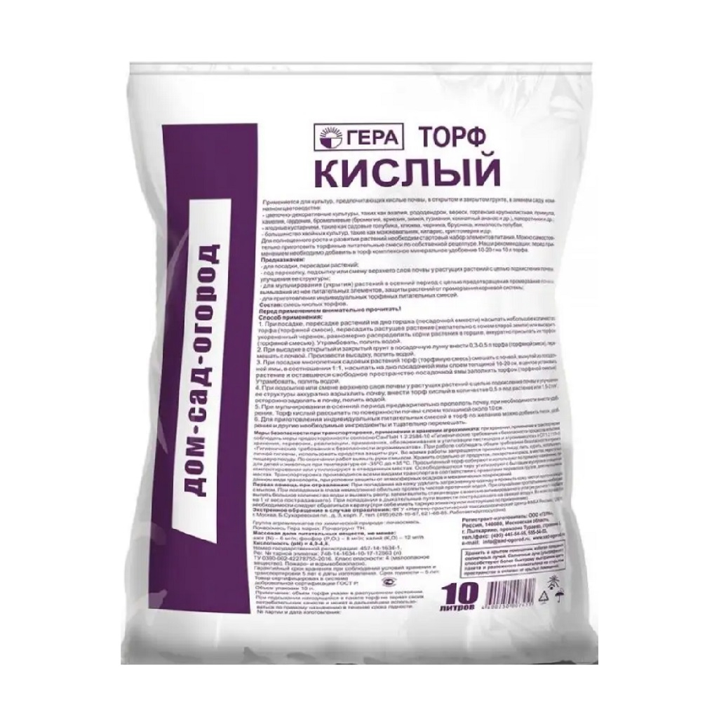 Торф кислый Гера для растений в открытом и закрытом грунте, 10 л применяется для культур, предпочитающих кислые почвы, в открытом и закрытом грунте, в зимнем саду, комнатном цветоводстве: цветочно-декоративные культуры, таких как азалия, рододендрон, вереск, гортензия крупнолистная, примула, камелия, гардения, бромелиевые (бромелия, вриезия, эхмея, гузмания, комнатный ананас и др.), папоротники и др.; ягодные кустарники, такие как садовые голубика, клюква, черника, брусника, жимолость голубая; большинство хвойных культур, такие как можжевельник, кипарис, криптомерия и др.