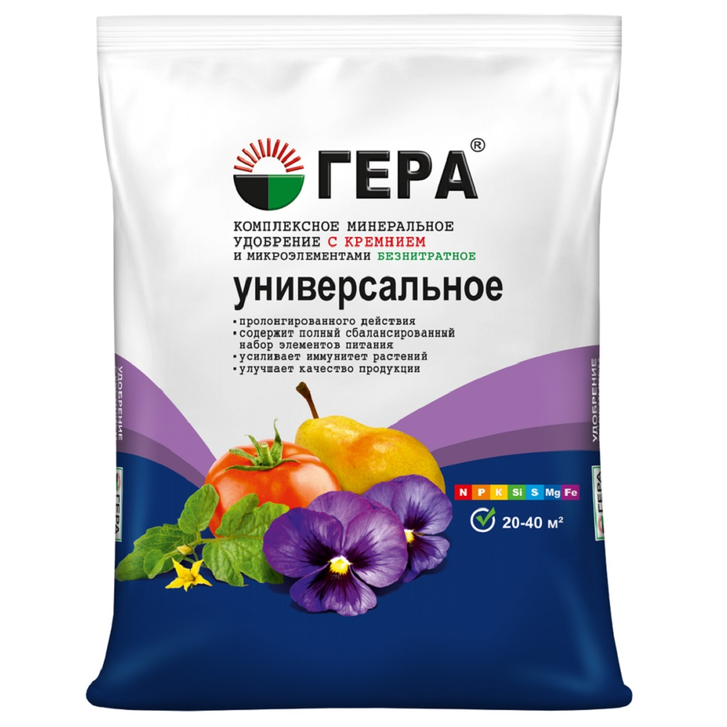 Удобрение Гера Универсальное c кремнием и микроэлементами, 0.9кг - это комплексное минеральное удобрение (тукосмесь) на основе азотно-фосфорно-калийного удобрения и диатомита. Предназначено для основного внесения и подкормки в период вегетации овощных, плодово-ягодных, цветочно-декоративных культур, газонных трав, всех видов декоративных садово-парковых растений в открытом и защищенном грунте. Содержит полный сбалансированный набор элементов питания, необходимых для нормального роста и развития растений. Наличие в диатомите кремния в аморфной форме, легко растворимой для питания растений, способствует усвоению и удержанию влаги, питательных веществ и постепенной их отдаче корневой системе растений, тем самым позволяя снизить нормы расхода NPK и других элементов питания растений. Удобрение способствует ускорению созревания и улучшению качества урожая овощных и плодово-ягодных культур за счет повышения содержания крахмала, сахаров и витаминов и дальнейшему хранению урожая, улучшает декоративные свойства цветочно-декоративных культур, ускоряет формирование и развитие цветков, а также повышает сопротивляемость растений к внешним неблагоприятным факторам (болезням, насекомым-вредителям, засухе, заморозкам и т.д.).
