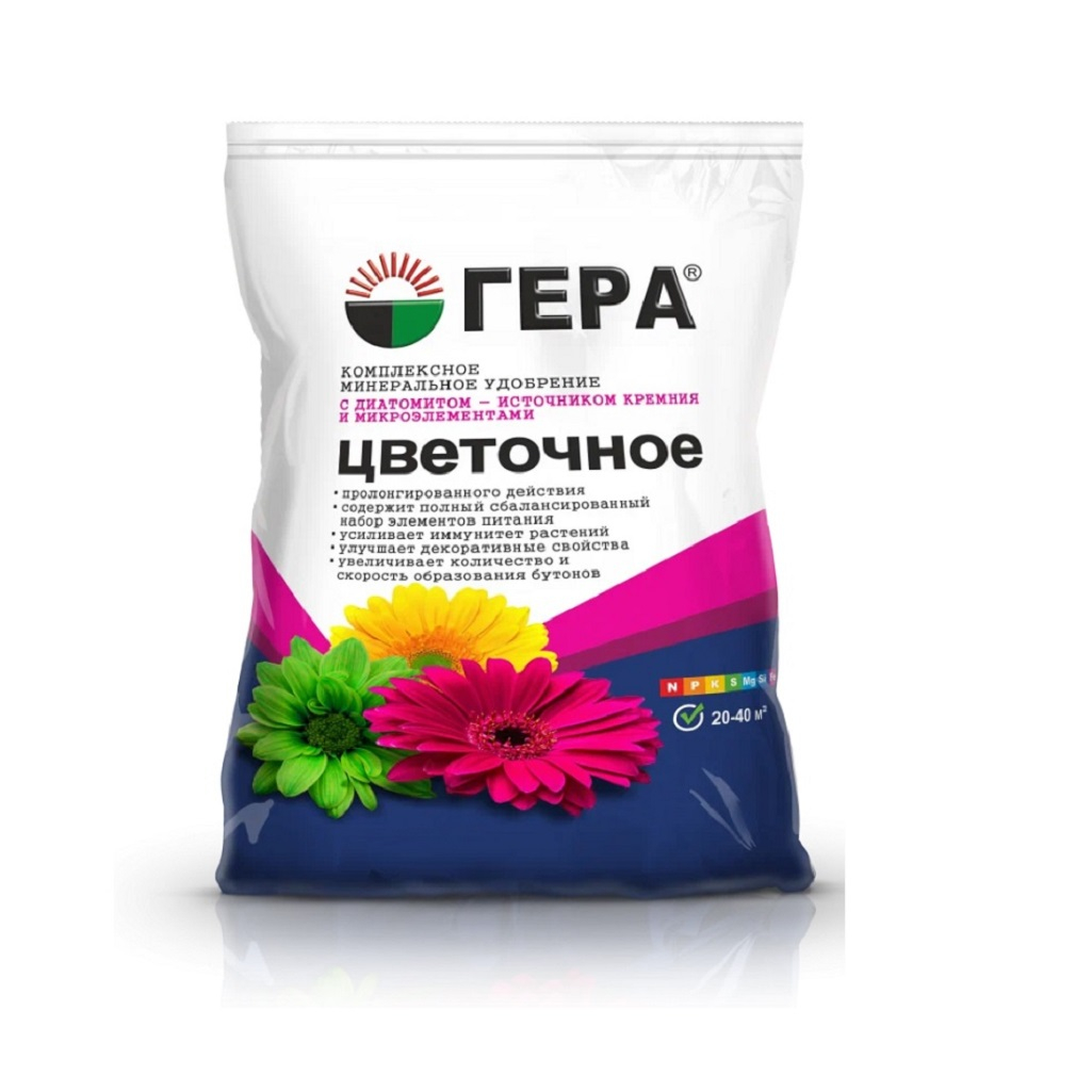 Удобрение Гера Цветочное комплексное минеральное с диатомитом, 0.9 кг предназначено для основного внесения и подкормки на всех видах почв однолетних и многолетних цветочно-декоративных садовых, оранжерейных, комнатных и балконных растений, а также декоративно-цветущих кустарников (роза, жасмин, сирень, гортензия и другие). Содержит полный сбалансированный набор элементов питания, необходимых для нормального роста и развития растений.