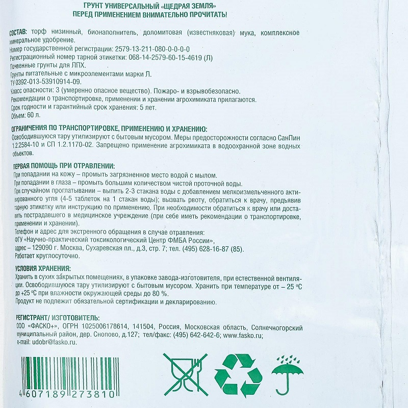 Технические характеристики грунта Фаско Щедрая земля 60 л