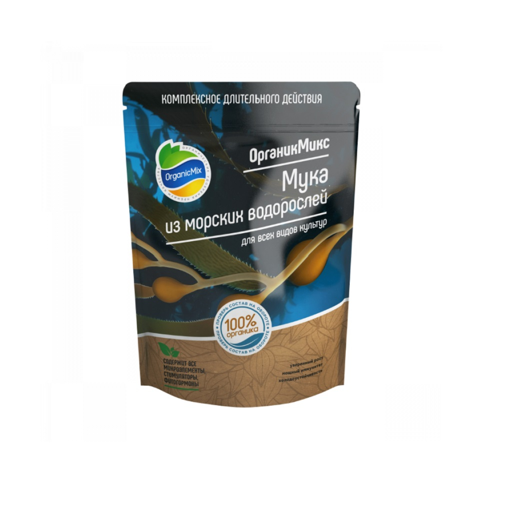 Удобрение OrganicMix Мука из морских водорослей, комплексное длительного действия, 200 гр - это порошок бурых водорослей, произрастающих в холодных северных морях. Удобрение характерно высоким содержанием активных веществ, фитогормонов и витаминов, он мощно стимулирует рост и иммунитет.